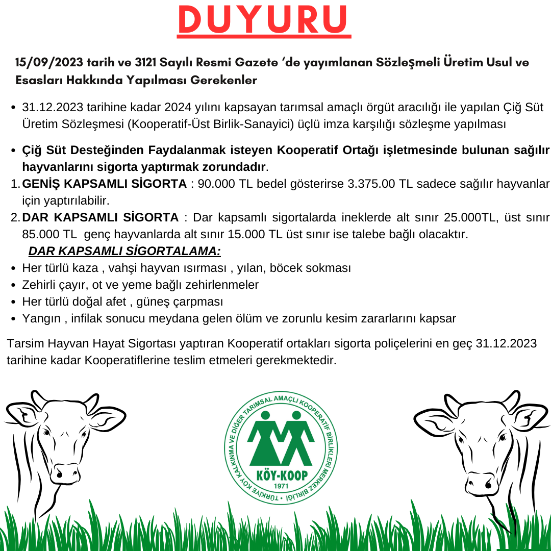 Bize UlaşınTarımda ve Hayvacılıkta her türlü verimliliği arttırıcı tedbirler almak, kooperatif ve birliklerin her türlü ürün ve mamullerinin kalitesini yükseltecek girişimlerde bulunmak, teknik faaliyetlerde bulunmak, bitkisel ve hayvansal mahsulleri değerlendirmek, işleme muhafaza ve pazarlama ile ilgili her türlü fonksiyonları yerine getirmek için gerekli çalışmaları yapmak ve yaptırmak, kooperatif çalışmalarını koordine etmek, kooperatif eğitim ve öğretim faaliyetlerinde bulunmak, kooperatifçiliği geliştirmek, vb konular yer almaktadır.